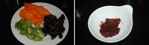 1胡萝卜去皮洗净,和青椒一块切菱形,水发木耳撕小块备用