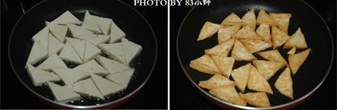 3热锅上油,油热后放入切成三角形的老豆腐块