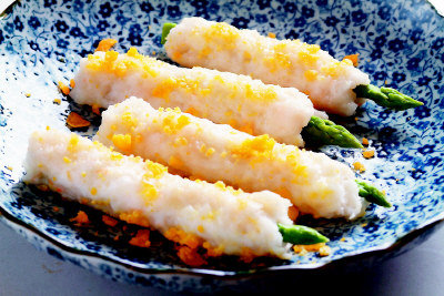材料:蘆筍10支,太白粉、鹹蛋黃少許、草蝦10隻(可用蝦泥替代,與花枝漿比例為5:1)、花枝漿100g、蛋白1個、鹽、白胡椒少許、白膘油40公克(整塊的固態豬油)。