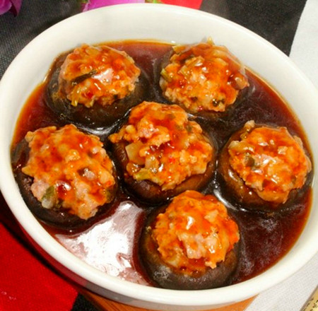 (1)把香菇挖空洗干净,然后把肉末、泡菜、料酒、香葱混合。