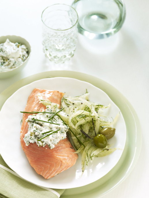 材料:1个中等大小球形茴香,将球状部分切薄片,藻体部分作为装饰配菜;4片(170g,每片大约2.5cm厚)去皮三文鱼片;盐和胡椒;1/4杯干白葡萄酒;1/4杯水;1杯原味低脂酸奶;1/4杯去核青橄榄,切碎,加入橄榄做配菜;1/4杯包装切碎的新鲜韭菜,加入韭菜作为配菜;1汤匙新鲜柠檬汁;1汤匙特级初榨橄榄油。