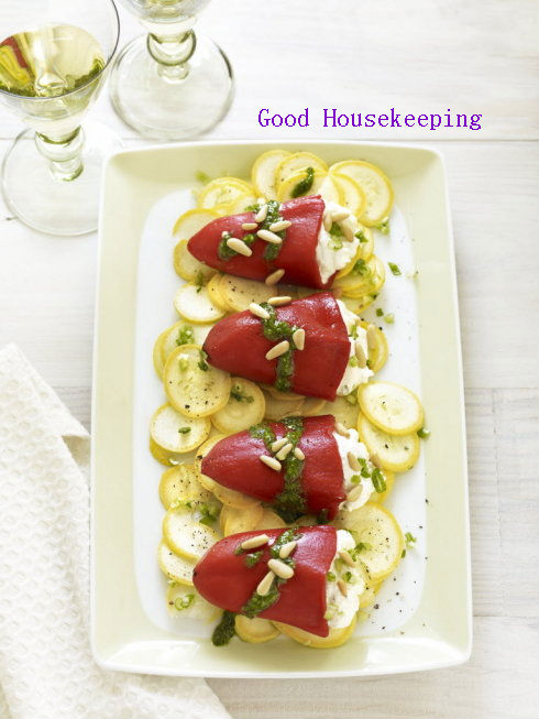 材料:5杯部分脱脂凝乳奶酪;1/4罗马诺羊奶酪,磨碎;1个绿洋葱,只取绿色部分,切碎;12个烤制红椒,拍干;1/2杯包装新鲜罗勒叶;1/2杯平叶欧芹叶;1汤匙水;3汤匙特级初榨橄榄油;2个黄色西葫芦,切成圆薄片;2汤匙烤好的松籽。