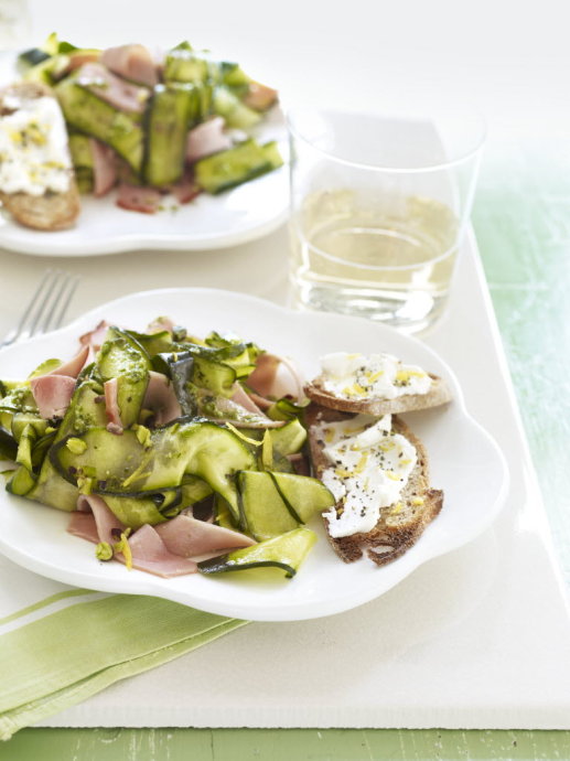 材料:900g夏南瓜(大概5个),去尾;4片熟食火腿(113g),切成1cm的带状;1个柠檬;2/3杯盐腌开心果,去壳;1/3杯包装新鲜薄荷叶;1/3杯包装新鲜罗勒叶;1粒大蒜;盐和胡椒;3汤匙特级初榨橄榄油;2汤匙水;8片全麦面包(120g),烤一下;140g山羊奶酪,软化。