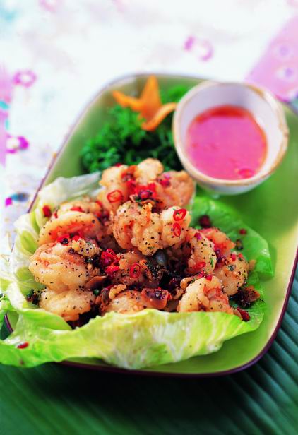原料:虾8只,泰国红尖椒2个,生菜2片。