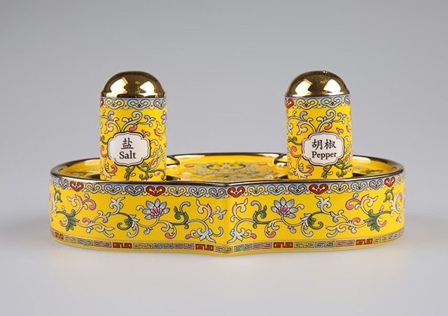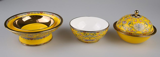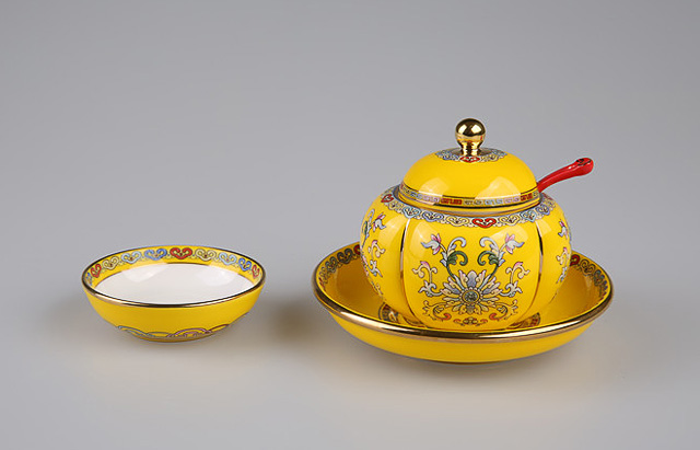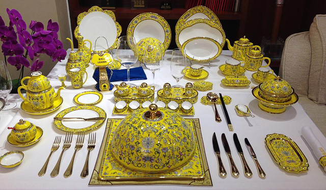 2014年11月10日,APEC国宴在奥运会场馆“水立方”举行,此次欢迎晚宴所使用的餐具,并不似以往国宴中使用的偏素色餐具,帝王黄的珐琅彩瓷在国宴主桌上异常抢眼。据此次国宴餐具主创设计师之一庄志诚介绍,这套餐具是以《诗经》中词句“和鸾雍雍万福攸同”寓意为主题设计,专为APEC国宴而作,“和鸾是车马上的铃铛,在设计的主体纹样中为磬纹,宝磬是礼乐之器,有祝福之意。和鸾雍雍,万福攸同,宾客至,同多福。”