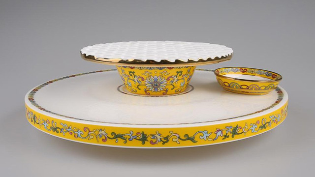 展示盘采用方形,菜盖用的是圆形,符合中国传统文化中天圆地方的概念,富有民族意味。作为系列中“占地面积”最大的餐具,宝塔顶盖的设计灵感来自于北京的天坛。在中国传统餐具中,并没有使用“冷菜盖”的习惯,而西餐则惯用金属制作冷菜盖。“我们是用陶瓷做的,因为冷菜盖的体积很大,要做到弧面的精准,难度非常大。”