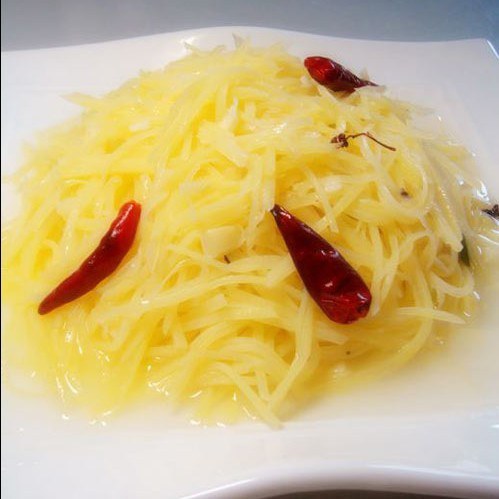 酸辣土豆丝是一道老百姓餐桌上最常见的家常菜,其主料土豆性平和胃,有改善肠胃功能、预防高血压的功效。辅料辣椒富含维生素C,可增强体力、冠状动脉硬化。该菜用料简单,好学易做,营养丰富,清爽可口,很受人欢迎。 特点:色泽光鲜,外焦里嫩,酸辣可口,让人口齿生津,酸辣下饭。