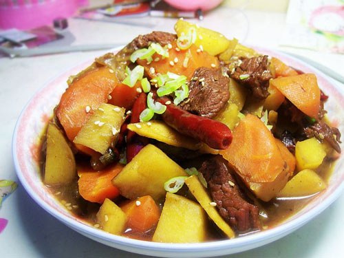 牛肉含蛋白质、脂肪、维生素 B1、维生素 B2 、钙、磷、铁等成分。土豆含大量淀粉、蛋白质和胶质柠檬酸、乳酸及钾盐。牛肉味甘性平,能补脾胃,益气血,强筋骨,止消渴,民间有“牛肉补气,与黄芪同功”之说。虽然有牛肉不能与土豆一起吃的说法,但是偶尔吃吃,也无所谓了。