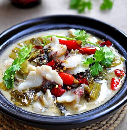 5.将腌好的鱼片放入汤中,稍凝固后用筷子划散,等鱼片煮至变色,加鸡精提味后盛出,浇少许热油,撒上香菜即可。