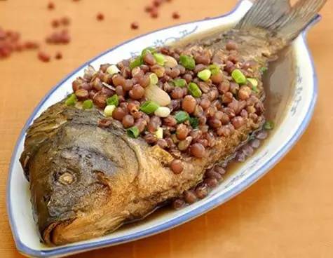 鲤鱼1条、泡好的红小豆150克、油、生姜5片、蒜片、葱结1个、淀粉、陈醋、酱油、盐、料酒、葱花