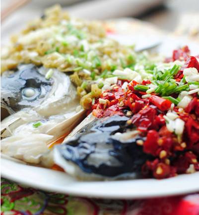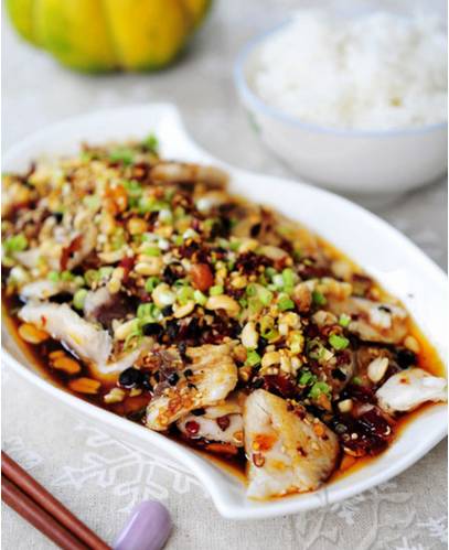 5.锅中加水,水滚开后,将鱼放在蒸架上,需大约蒸15分钟,取出再洒上一些葱花、红椒,烧一小勺热油,浇上即可。