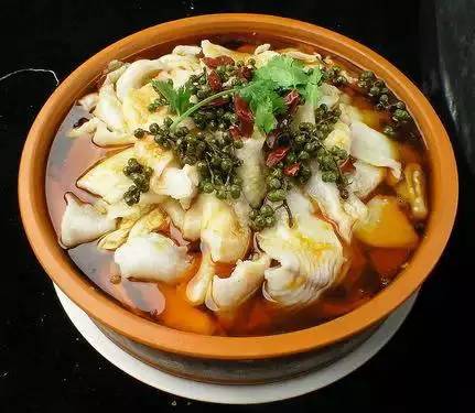 4.将很多油烧热后加干红辣椒和花椒若干,待油锅中辣椒颜色略微变黑的时候,将油浇在鱼片上面