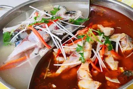 4.然后将鱼骨、鱼片分别放入锅中;待鱼片表面凝固成形时,速加清水1500克,再放入料酒、火锅底料、干辣椒节、鸡精、味精、精盐、白糖、葱节等调料,起锅倒入火锅盆中,最后撒入油酥黄豆即可上桌。