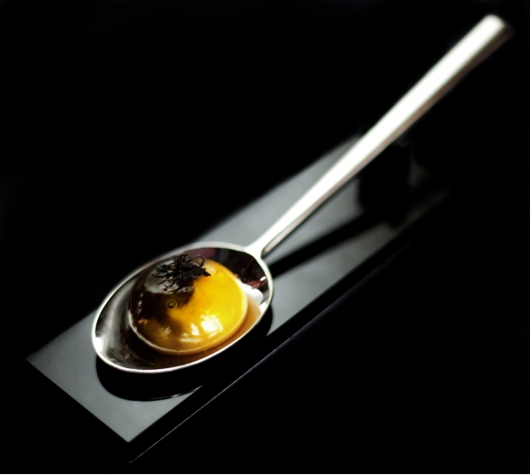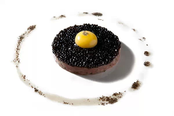 黄色的蛋芯,黑色的松露,最下层是诱人的鞑靼牛肉,对比鲜明的色彩,完美同心圆,强迫症患者的福音。