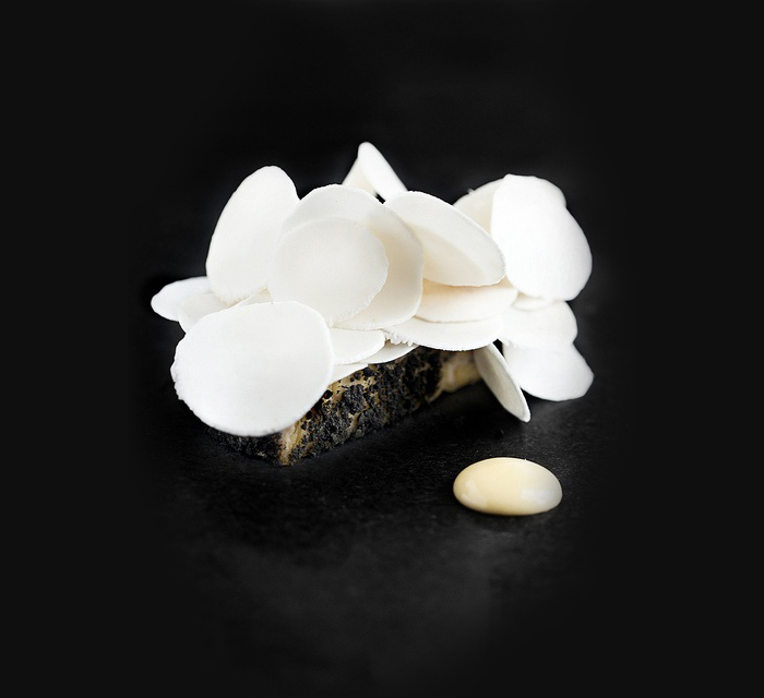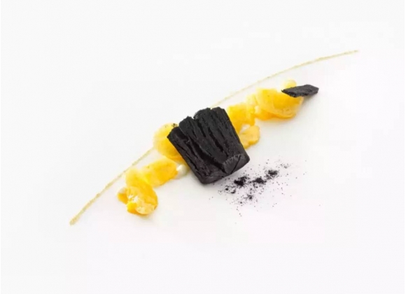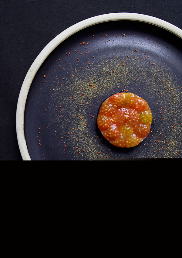 大西洋小龙虾卵点缀番茄,又是一个同心圆的摆盘方式,与黑色的盘子特别配。