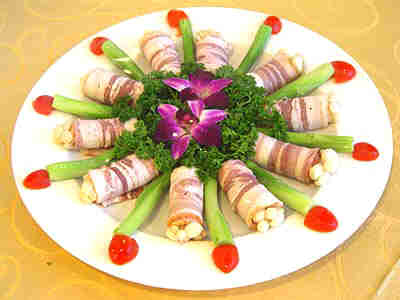 制作方法:把虾肉切成细粒,用盐、味精、料酒、胡椒,上味备用。烟肉切成薄片加入虾肉卷成卷状,上笼蒸熟,挂上蛋粉糊下油锅炸至外脆里嫩,码放在盘中,用沙拉酱挤在烟肉卷上。鲜芦笋焯水入味,摆放在盘中。