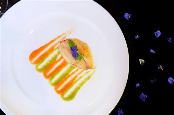 3、在盘中间隔划上青红椒泥,鱼柳放锅内煎熟后装盘即可。