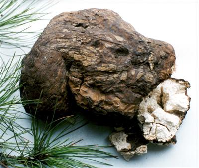 [茯苓霜 ]古人因看到茯苓长在老松树的根上,便以为它是松树精华所化生的神奇之物,称它为茯灵(茯苓)、茯神或松腴。晋朝葛洪在他的《神仙传》中就有“老松精气化为茯苓”的说法。其实,茯苓是寄生在松根上的真菌。它长在20~30厘米的地下,菌核呈球形或不规则块状,大小不一。别看茯苓其貌不扬,可是一味著名的中药。为了入药方便,人们为它的每个部位都起了相应的名字:外表被覆的一层褐色外皮叫茯苓皮,断面靠外淡红色疏松的一层叫赤茯苓,内部白色致密的部分称白茯苓。还有些茯苓中间有一道松根穿过,靠近树根的部分称茯神,中间的树根则叫它茯神木。
