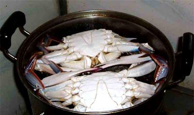 蟹又称无肠公子、含黄伯、郭索、拥剑、执火、彭越等。因其横行又统称螃蟹。螃蟹又分海水和淡水两类。笼蒸螃蟹使用的是淡水蟹,即河蟹,此蟹只能吃活的,其肉鲜美,食时需除去蟹的肠、胃、鳃和脐部。中医认为蟹有散瘀血,通筋络,续筋接骨,解漆毒等功效。但蟹不可以和柿子同食,因为易引起腹泻。蟹性寒,食用时需蘸姜、醋或饮酒,以暖胃怯寒,杀菌消毒。