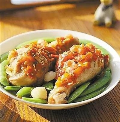 4.再将鸡腿蒸上二十分钟;拿出来后将甜豆摆在旁边。