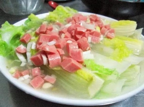 原料:娃娃菜、尖椒、葱蒜、火腿、油、酱油、糖、盐、水淀粉。
