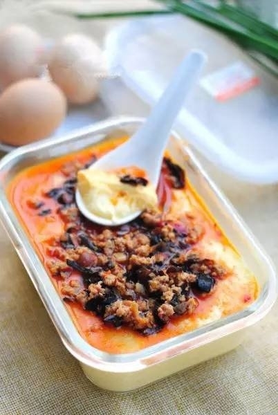 4.把在茄盒放到深碗或碟中,把鸡蛋汁浇在上面,隔水蒸12分钟。