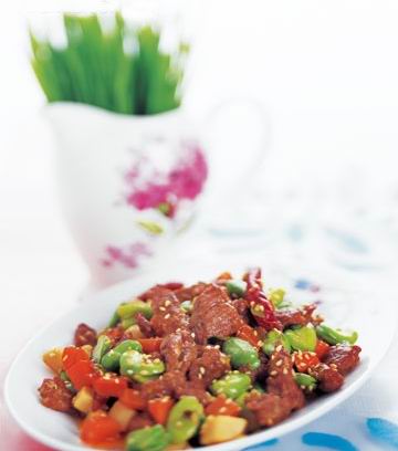 2.炒锅上火放油烧热,下牛肉滑油炒出。