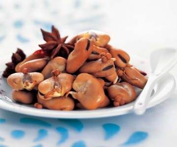 2.放入所有调料,加水淹没蚕豆并高出一指。大火煮开,转最小火慢煨1小时至酥烂即成。