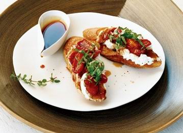 配料:圣女果800克,纵向切开、特级初榨橄榄油20克、苜蓿蜜30克、百里香叶子30克、盐15克、胡椒粉3克、意大利脆面包12片切成1.5厘米厚、意大利乳清奶酪220克、荞麦粉15克、罗勒叶6片简单切碎