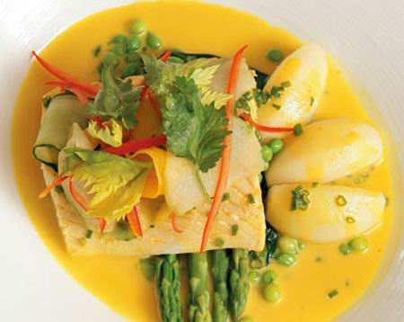 4. 把鱼汤加入咖喱粉、盐、胡椒、柠檬汁调味煮开后浇汁琳在盘上。