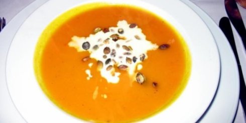 在大锅里将油加热,放入南瓜片、胡萝卜片和洋葱炒一下,加入蒜、月桂叶和小茴香粉,注入1升水,放入蔬菜汤料。将汤烧开后再中火煮30分钟,取出月桂叶。用搅拌器搅拌一下,按个人口味加入几滴塔巴斯科辣沙司、盐和胡椒。用汤匙将鲜奶油搅散,如果有新鲜的香芹撒在上面那就更好了,增色添味。