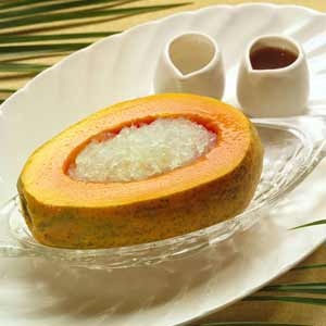 以新鲜木瓜、南北杏和雪耳炖成,木瓜可帮助消化、抗菌解热,南北杏止咳润肺,雪耳则能滋阴润肺、养胃生津。此款糖水味道香甜,无论冷吃或热吃都一样滋味。南北杏份量不宜过多,取10~15g左右,雪耳以片大身厚,完整不碎,色黄白,有光泽为佳。