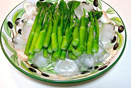 透明的冰块上嫩绿的芥兰整齐排列,让人感觉晶莹剔透之余更富清爽之意,芥兰口感清凉爽嫩 。