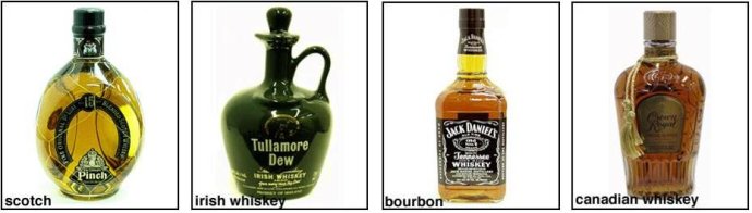 ——爱尔兰威士忌 Irish Whiskey, 麦芽糖不经过烘干处理,口味温和芳香,例如 Old Bushnells, Jamesons.