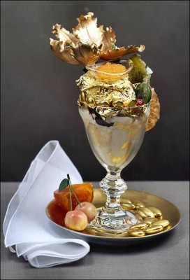 圣代吃过吧,肯德基、麦当劳、随便哪个西式简餐餐厅都有,这个也是圣代,不过一个1000刀。其实里边装的也就是香草冰激凌和巧克力冰激凌,水果什么的。只不过人家最上边加了一片叶子,金的,23K的哦。冰激凌选料上乘,连浇上去的巧克力也是世界上最贵的巧克力。还有一个专门吃这个冰激凌的勺子,18k的,不过吃完留下,不赠送哦。