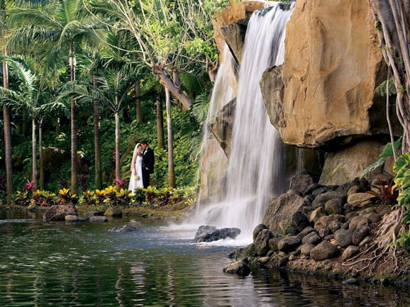 在万豪酒店室外的瀑布旁,晚上经常会举办派对。而这里的私人房间是和一个14英尺高的瀑布相邻,让人心旷神怡,仿佛置身于仙境。