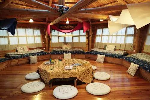 米亚罗农庄所有木屋都是全木建造,其中主楼大木屋是公共区,一共两层,每层平均100平方米,包含厨房、电影阁、吧台桌球室、榻榻米驿站等休闲娱乐设施。另外四栋则是独立客房木屋,尖塔的木屋内有复式的小阁楼,可以探星的天窗和复古的瓷白浴缸;而外形像是谷仓的圆形木屋则拥有最大的活动空间,很适合大家围坐在一起玩桌游或纯粹聊聊天。安静的田野里,充满异域风情的小屋,给人一种仿佛被时光遗忘的感觉。