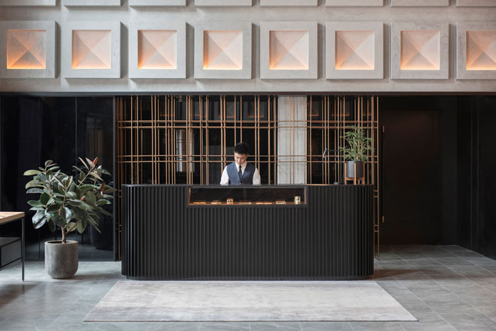 其他工业风的元素还包括一个黑色的金属楼梯和罗纹表面的接待台。接待台后,精致的金色细柱隔开了大堂区域的空间,白色墙壁上装饰着一排浮雕风格的方块,内嵌的灯光使得它们格外突出