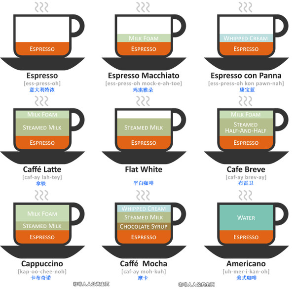 咖啡店里, 看到眼花缭乱的咖啡品种, 总弄不清楚要点什么? 不要紧, 其实很多人都遇到过这种囧况. 为了避免下次再手足无措, 跟我们一起来认识下最常见的咖啡吧