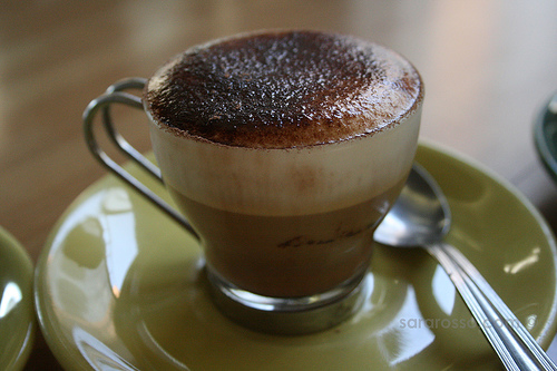 要点: 布雷卫就是ESPRESSO加一半牛奶一半奶油的混合物, 再浇上奶泡.