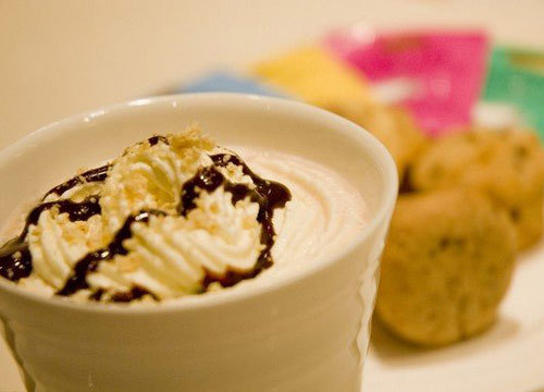 摩卡的配方成分就相对比较复杂了,在Espresso和牛奶的基础上,还有巧克力酱,顶端不是奶泡,而是打发的鲜奶油,还往往会挤上巧克力酱,或者撒上可可粉、肉桂粉,别有一番风味。由于“内容丰富”,通常售价较高,也比较大杯。巧克力和奶油都有甜味,因此摩卡咖啡是苦甜结合的典范。