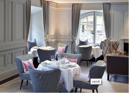 这是一家请来顶级设计师主持打造的咖啡馆。每天下午,法国最顶尖的烘焙师 Antoine Netien 和 Tom Clark 会亲自来到这里奉献顶级品质的咖啡。为了与这种气氛相适宜,酒店特别聘请了来自佛罗伦萨的设计师 Michele Bonan 主持餐厅的装潢与装饰。设计师设想这家餐厅与巴黎许许多多的高级成衣店一样带给人们由内而外的舒适体验,所以选择了黑白相间图案的沙发椅搭配粉色缎面靠垫,灰色沙发的天鹅绒材质高贵而不张扬,白色的天花板和墙壁则渲染了真正的贵族气质。地毯和窗帘是意大利布艺工坊 Dedar 的作品。