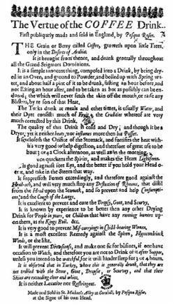 17世纪:咖啡能治百病?这篇1652年的文章是伦敦一位咖啡店店主Pasqua Rosée为了推广咖啡的功效所作的。文章称,咖啡可以帮助消化,缓解并治愈痛风、坏血病,减轻咳嗽、头疼与胃疼,甚至可以预防流产。