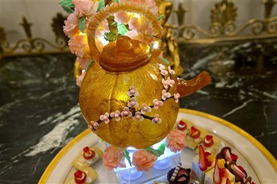 头盘是美日融合菜式鞑靼吞拿鱼腩及西泽刺身沙拉 报道称,头盘是美日融合菜式鞑靼吞拿鱼腩及西泽刺身沙拉,由日本美食节目《铁人料理》知名大厨森本正治负责,沙拉以透明醋酸人造纤维包裹,再用日本特色“水引”绑住,如一件礼物等待宾客打开。