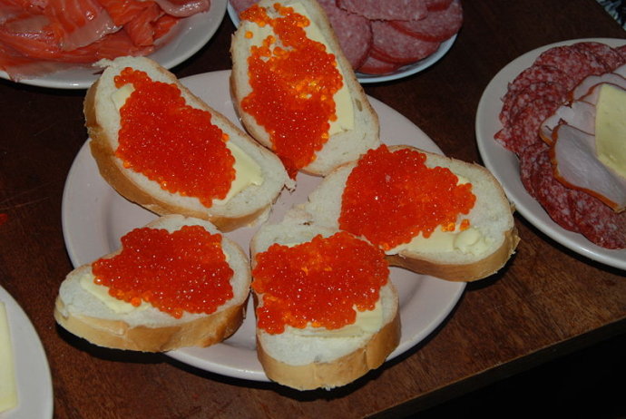含有鸡蛋的三明治,煮鸡蛋或鸡蛋沙拉通常切片,但可以用油炸或(很少)炒鸡蛋,配上当地鱼子酱,当地称为kaviar。