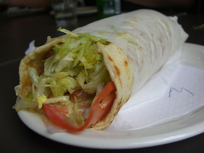 用饼皮塔饼卷上腌制后火热串烧出来的羊肉,牛肉,猪肉或鸡肉,加上您选择的生菜,西红柿,奶酪,红洋葱,浇上酸奶黄瓜酱。