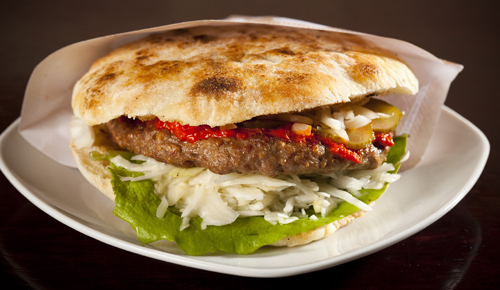 由一种烤饼面包做成的夹心三明治,有时火腿用代替牛肉。