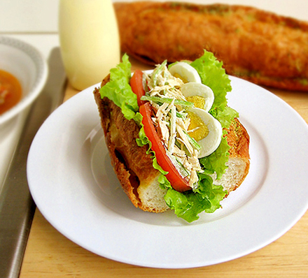 5.香芹放入沸水中焯烫一下,放入盛鸡肉丝的大碗中,加多一点沙拉酱、一点点盐和白胡椒粉拌匀。法式面包切成12厘米左右的长段,再从中间切一刀,不必完全切断,开口内抹上一层黄油,将西红柿片、生菜叶、拌好的鸡肉丝、鸡蛋片一起夹在面包内就好了。