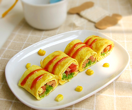 5.然后放上蔬菜火腿丝,将圆饼卷起,再略煎一下就可以关火了。