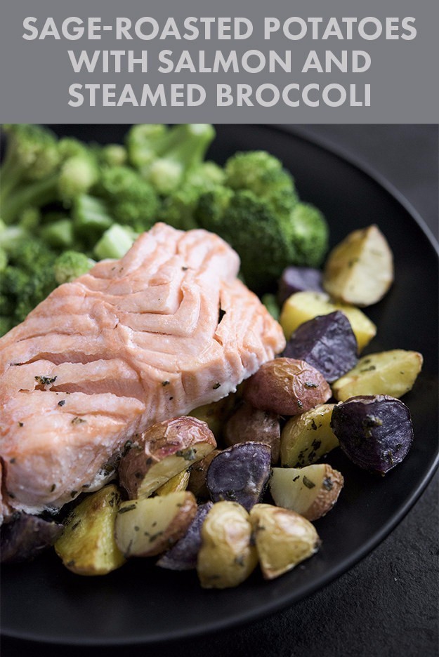 一顿晚餐吃不了这么多,有一半的土豆、西兰花和一块三文鱼就够了。将所有的食材搭配在一起吃就可以啦!